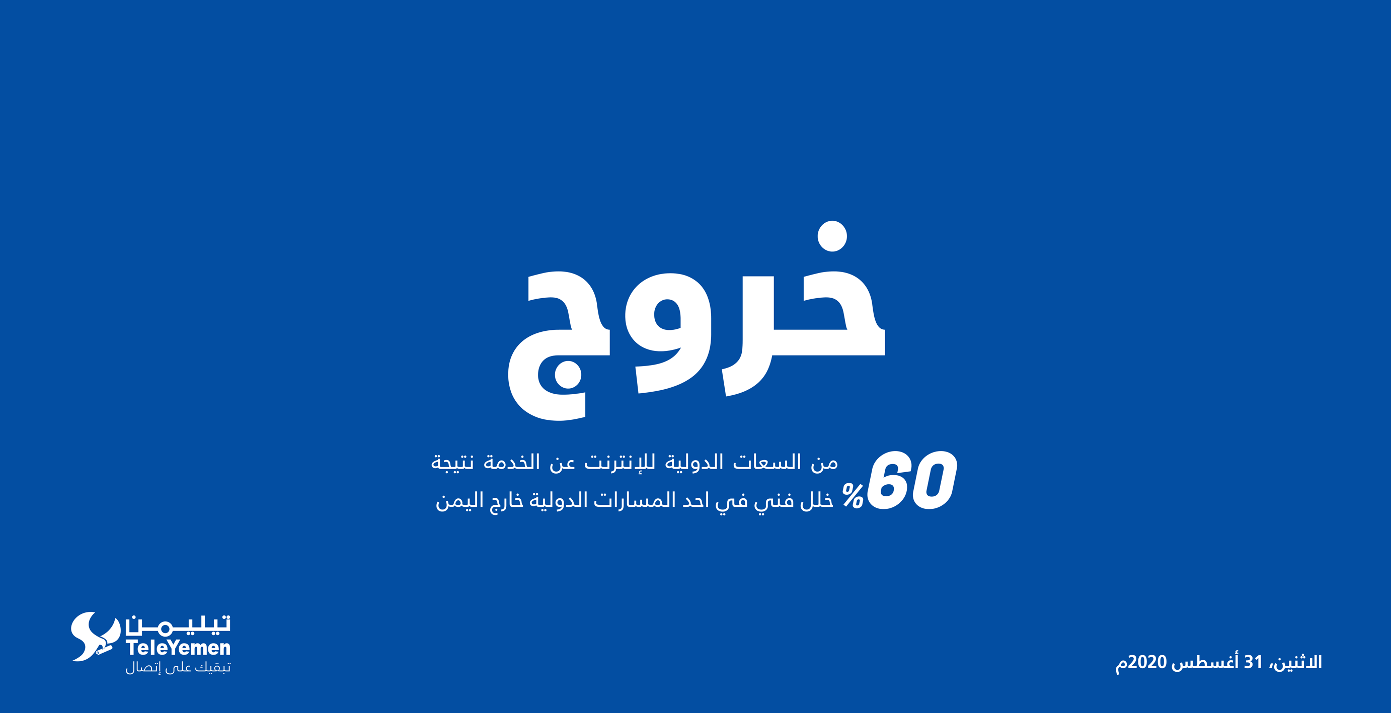 صرح مصدر مسئول في المؤسسة العامة للاتصالات والشركة اليمنية للاتصالات الدولية (تيليمن) بأن 60 بالمائة من السعات الدولية للإنترنت قد خرجت عن الخدمة نتيجة خلل فني في احد المسارات الدولية خارج اليمن.